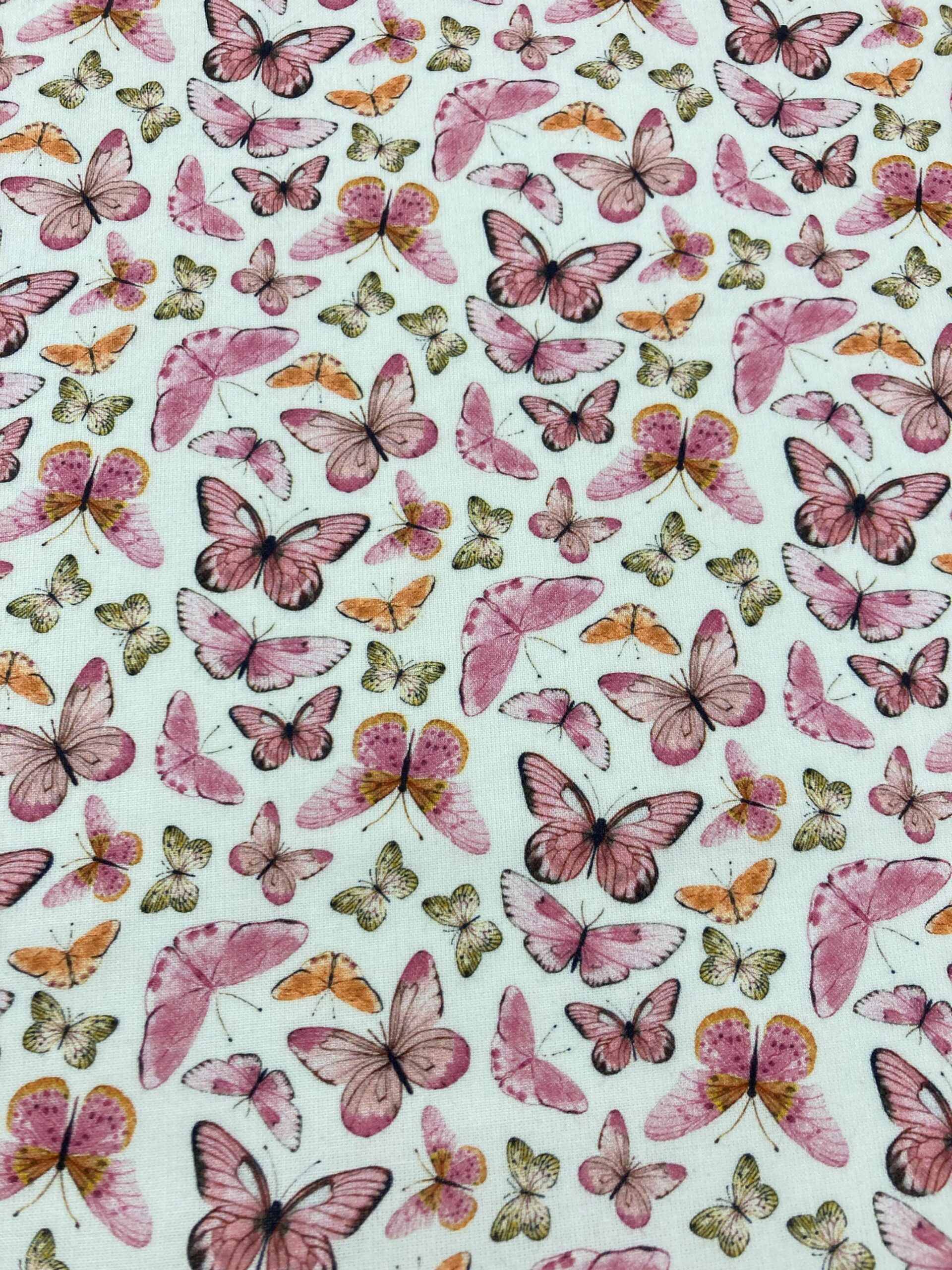 Algodón con fondo blanco y estampado de mariposas en tonos rosas, verdes y naranjas