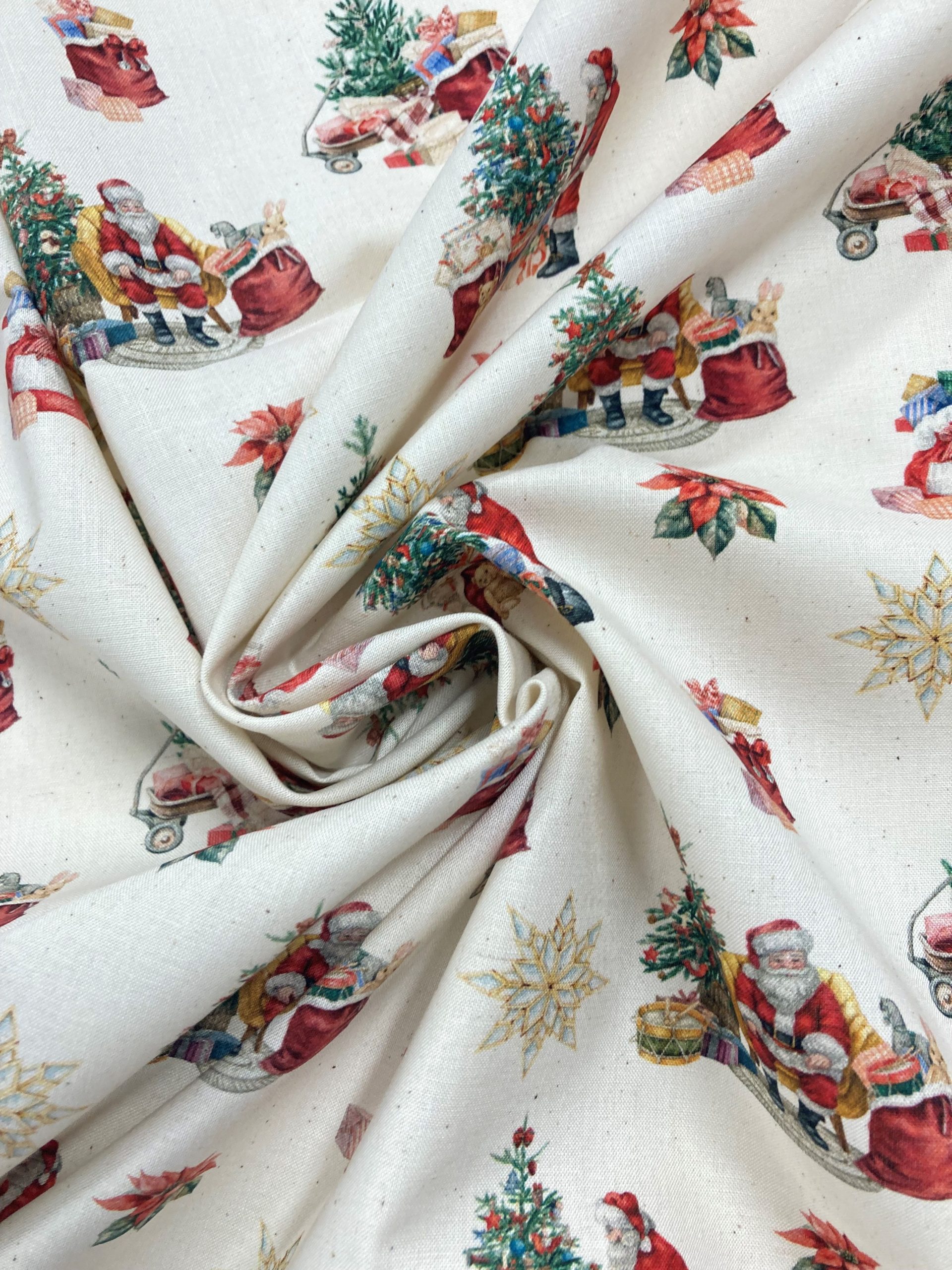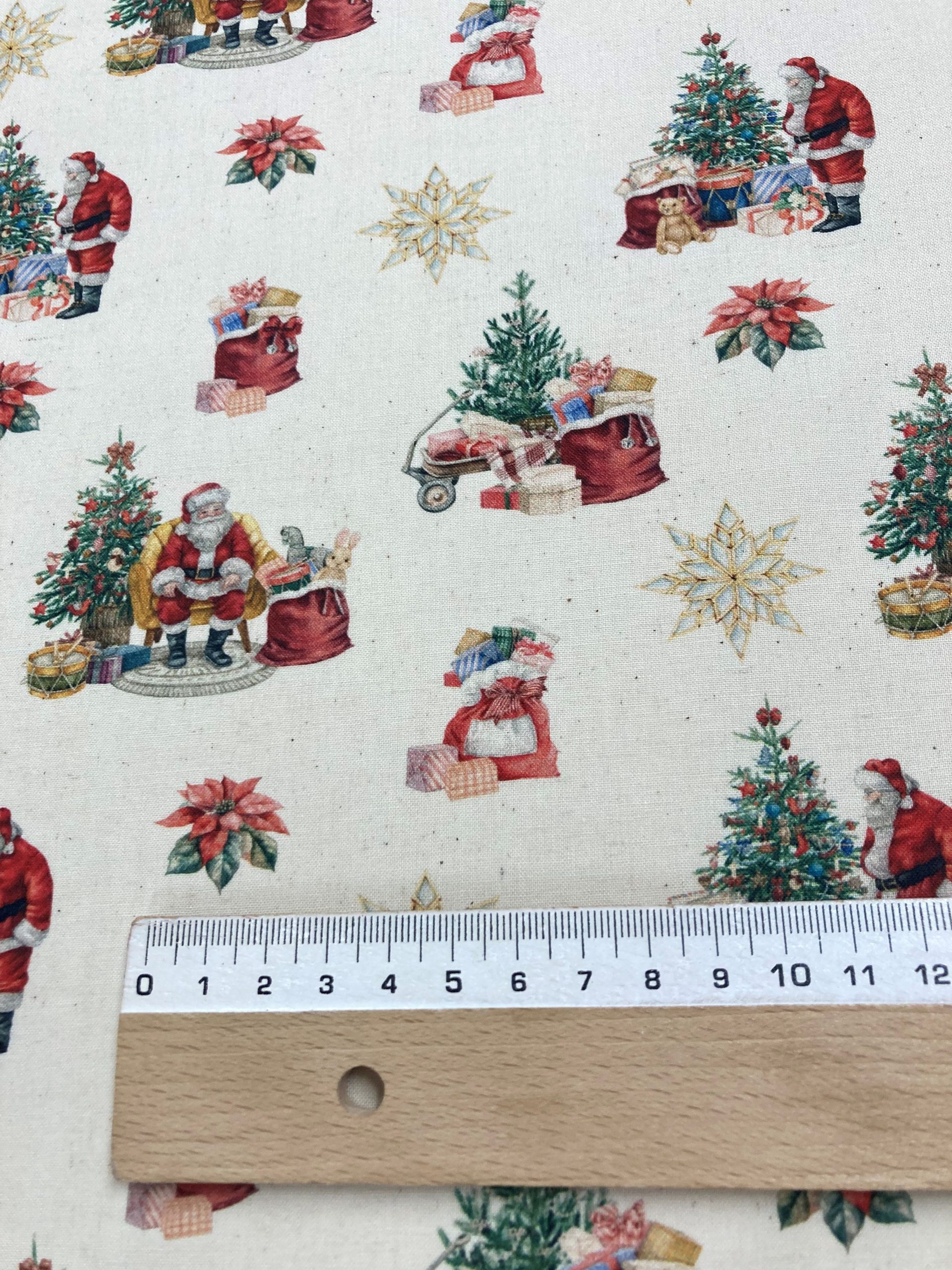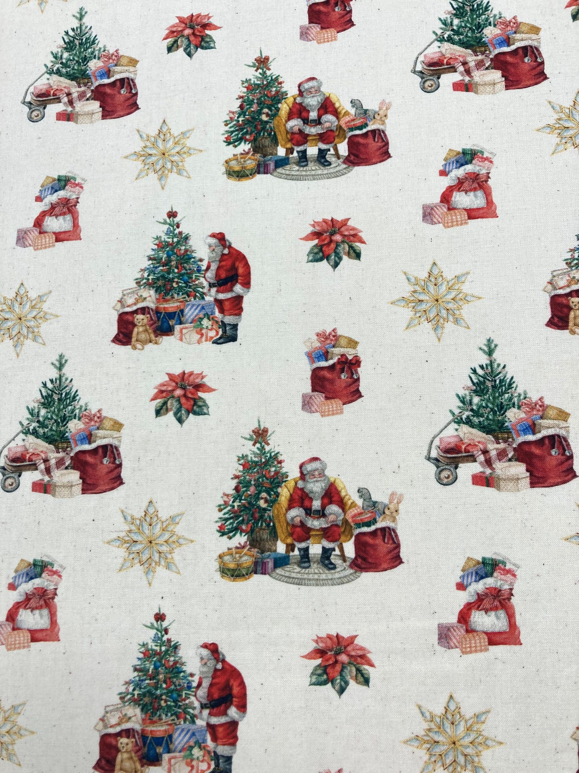 Estampado navideño de arboles, regalos y papa noel en tono verde, rojo.. y fondo beige