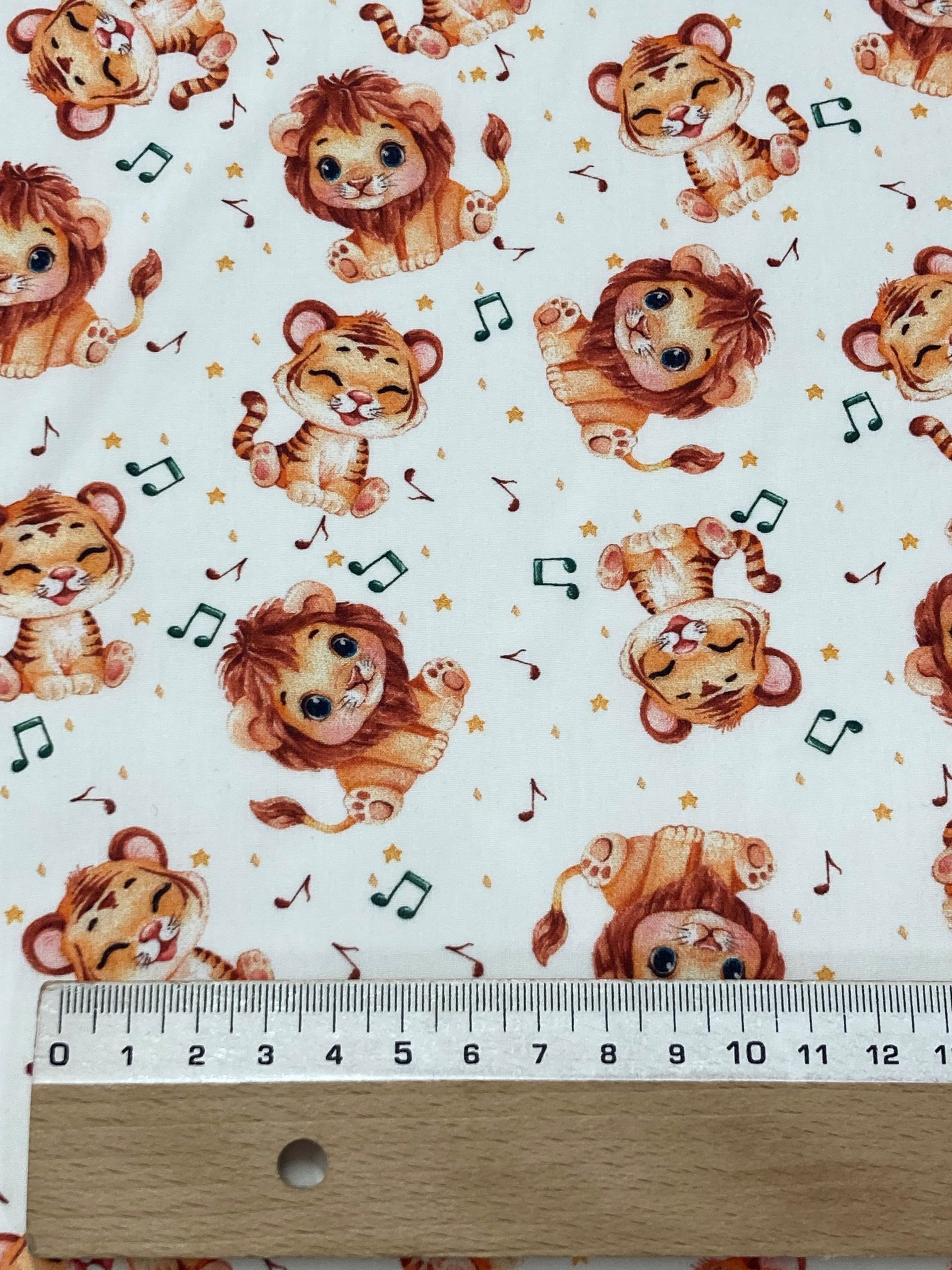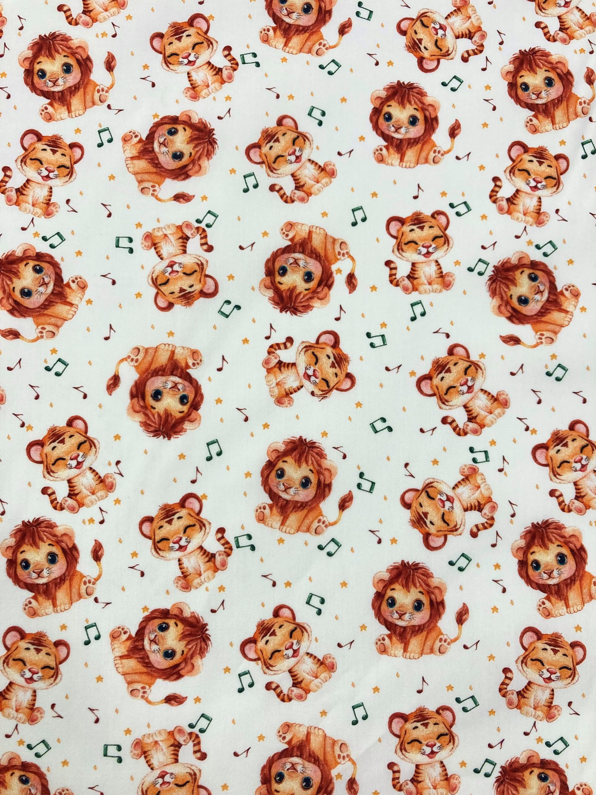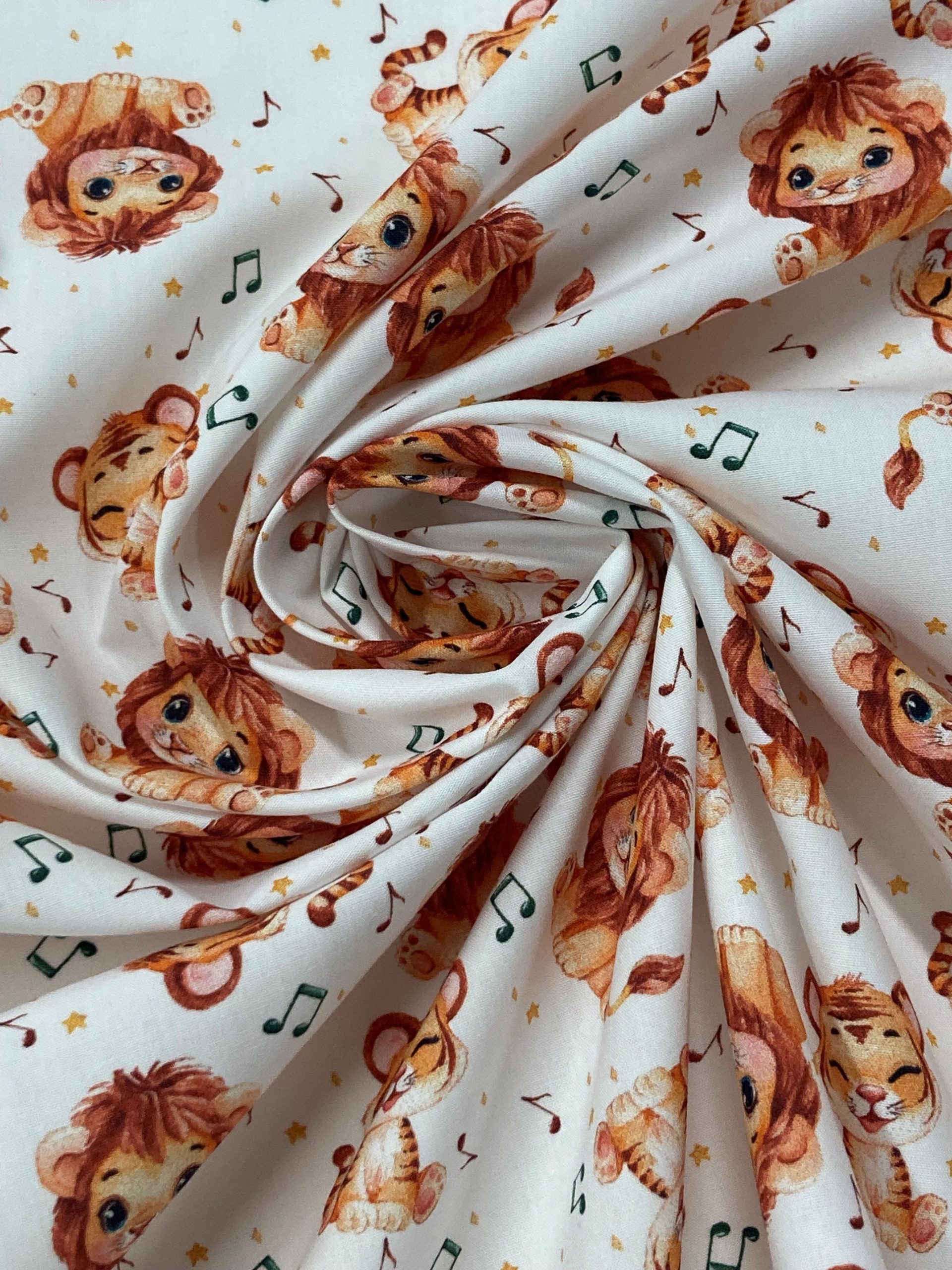 Tela de algodón con fondo blanco, dibujo de tigre,león y notas musicales.