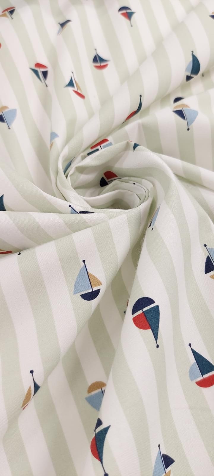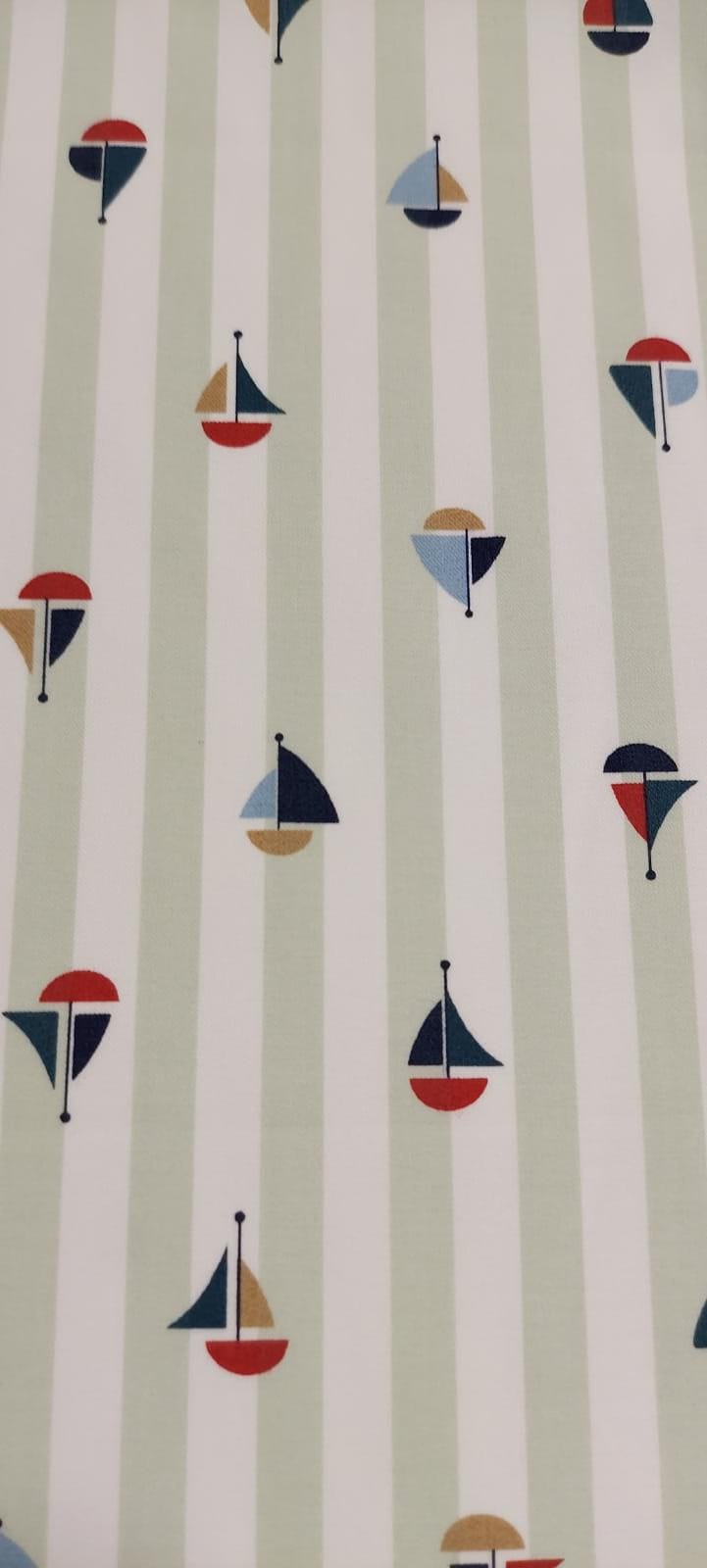Bonito algodón estampado con motivo marinero de barquitos sobre rayas alternas en blanco y verde menta muy claro. Los barquitos son en color rojo, marino, celeste y camel.