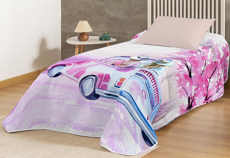 Colcha bouti estampada con impresión digital en acolchado fino termosellado de la marca Karamelo.