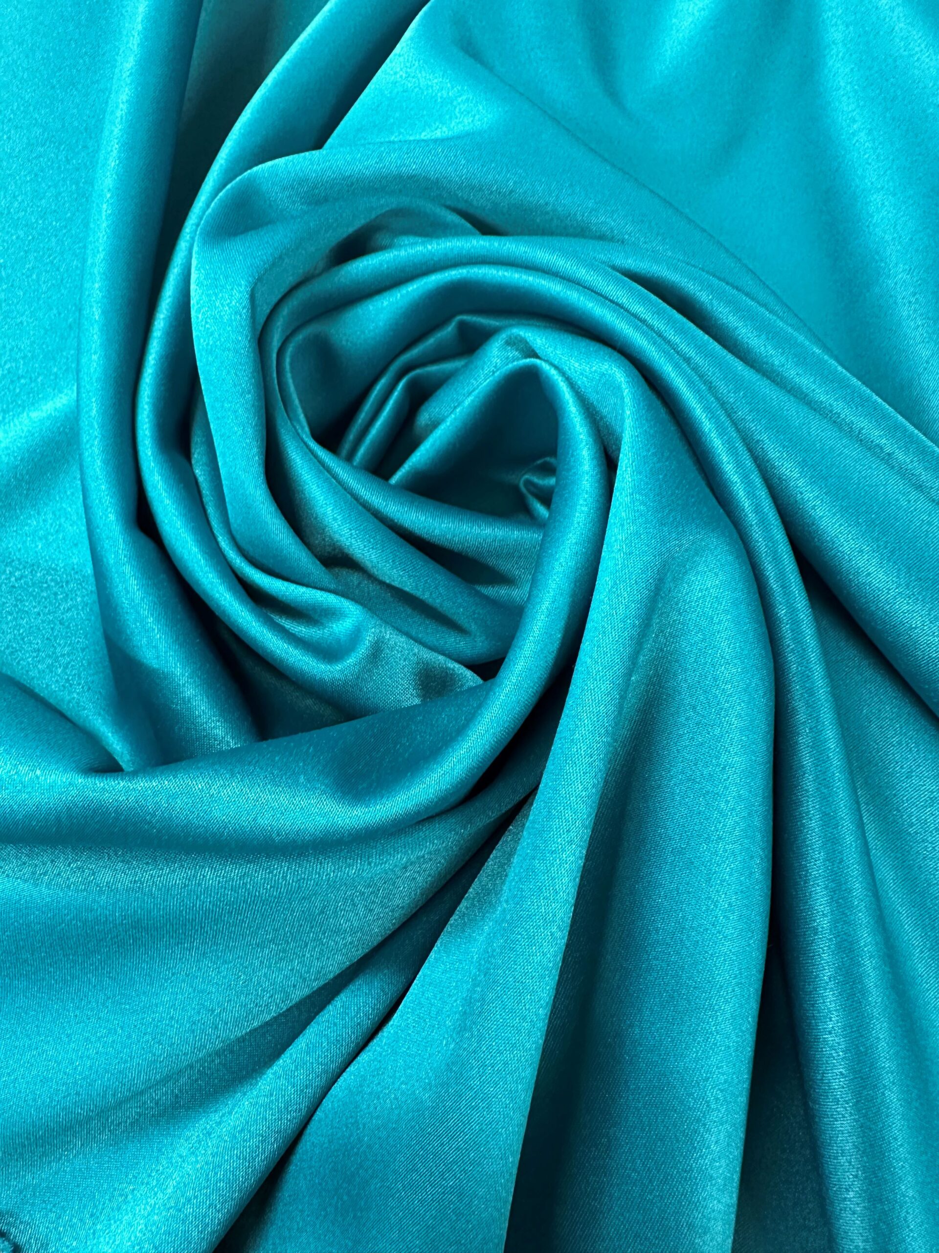 Tela de tipo crep con elastano, es satinada y es de caída media.