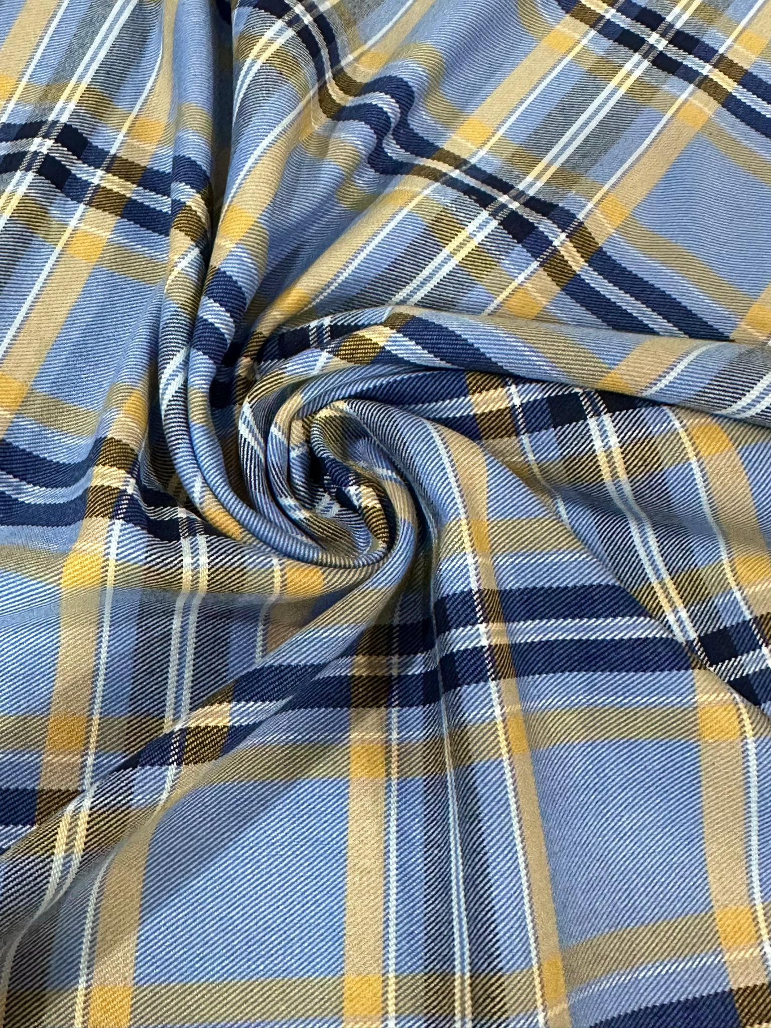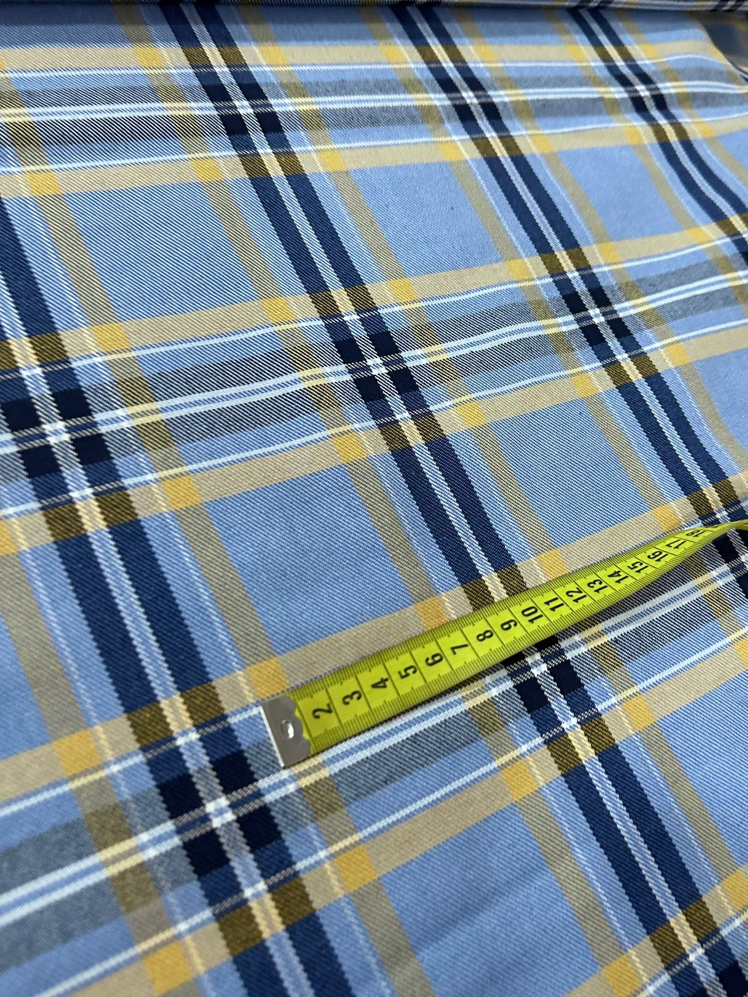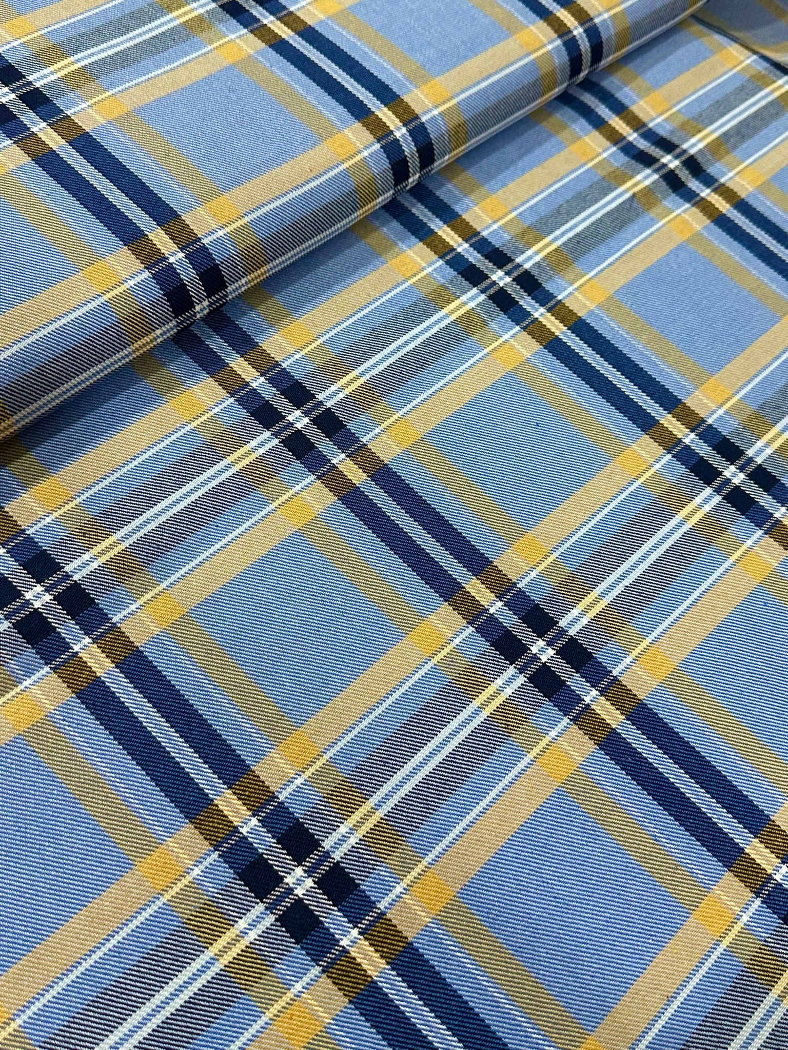 cuadro escoces con fondo celeste y cuadros en tonos marino/camel . Tela con cuerpo, y con un poco de caída y de textura suave, un tejido cálido. Ideal para la confección de faldas, vestidos y chaquetas, así como trajes y complementos de moda.