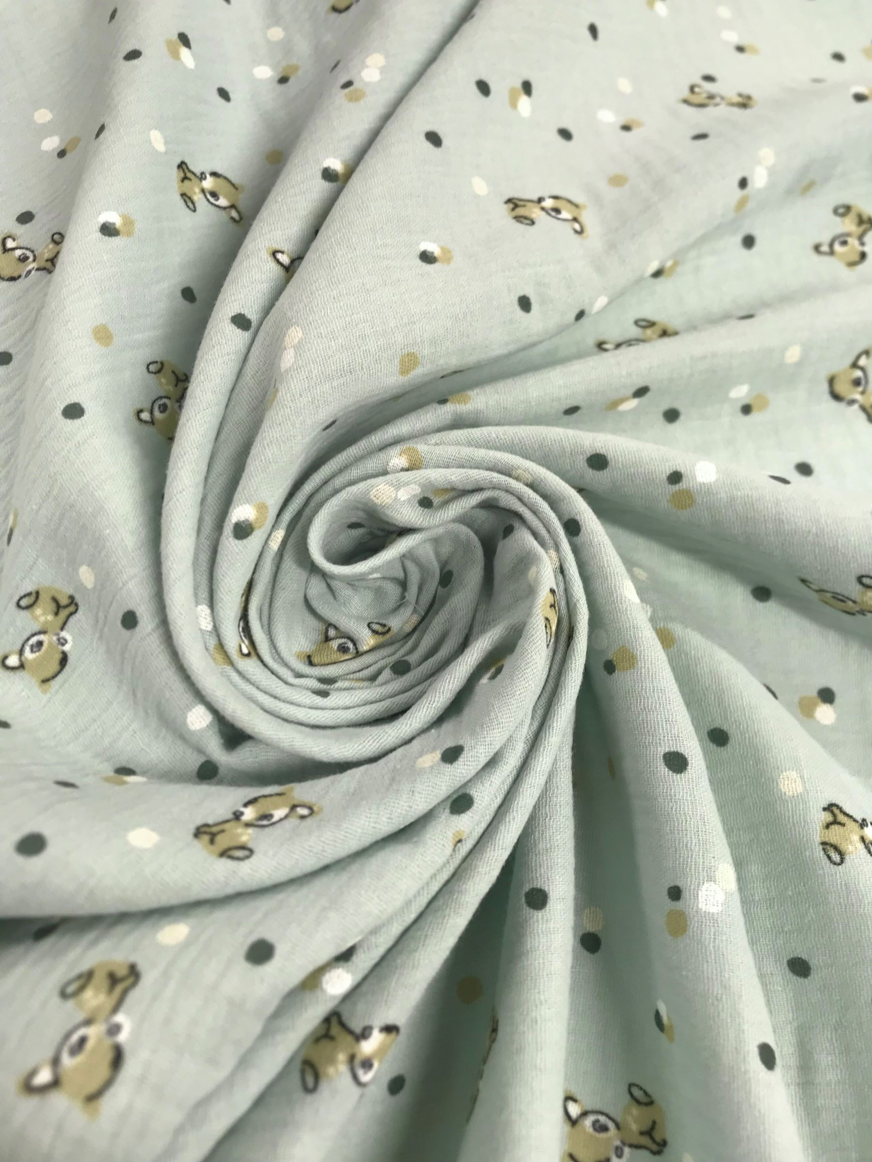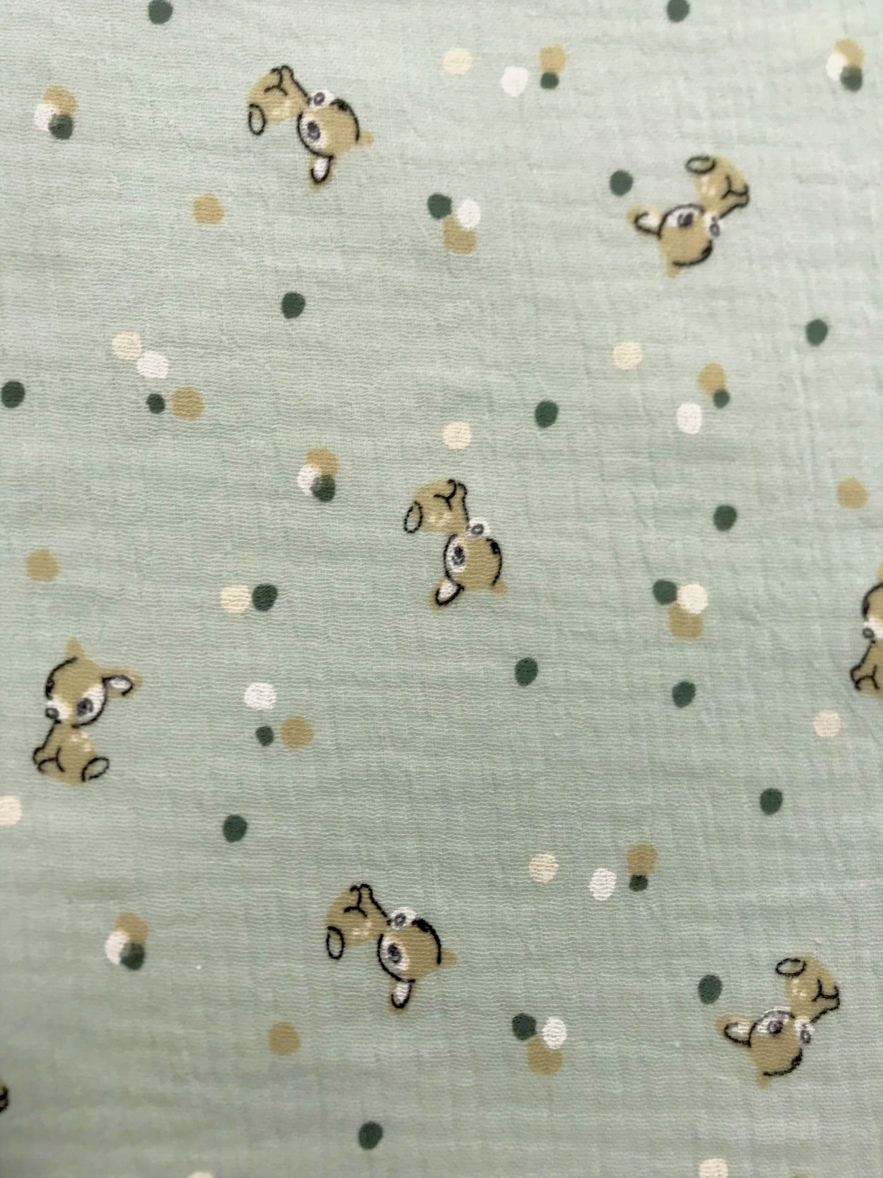 Doble gasa fondo verde mint y dibujo de cervatillos en color camel