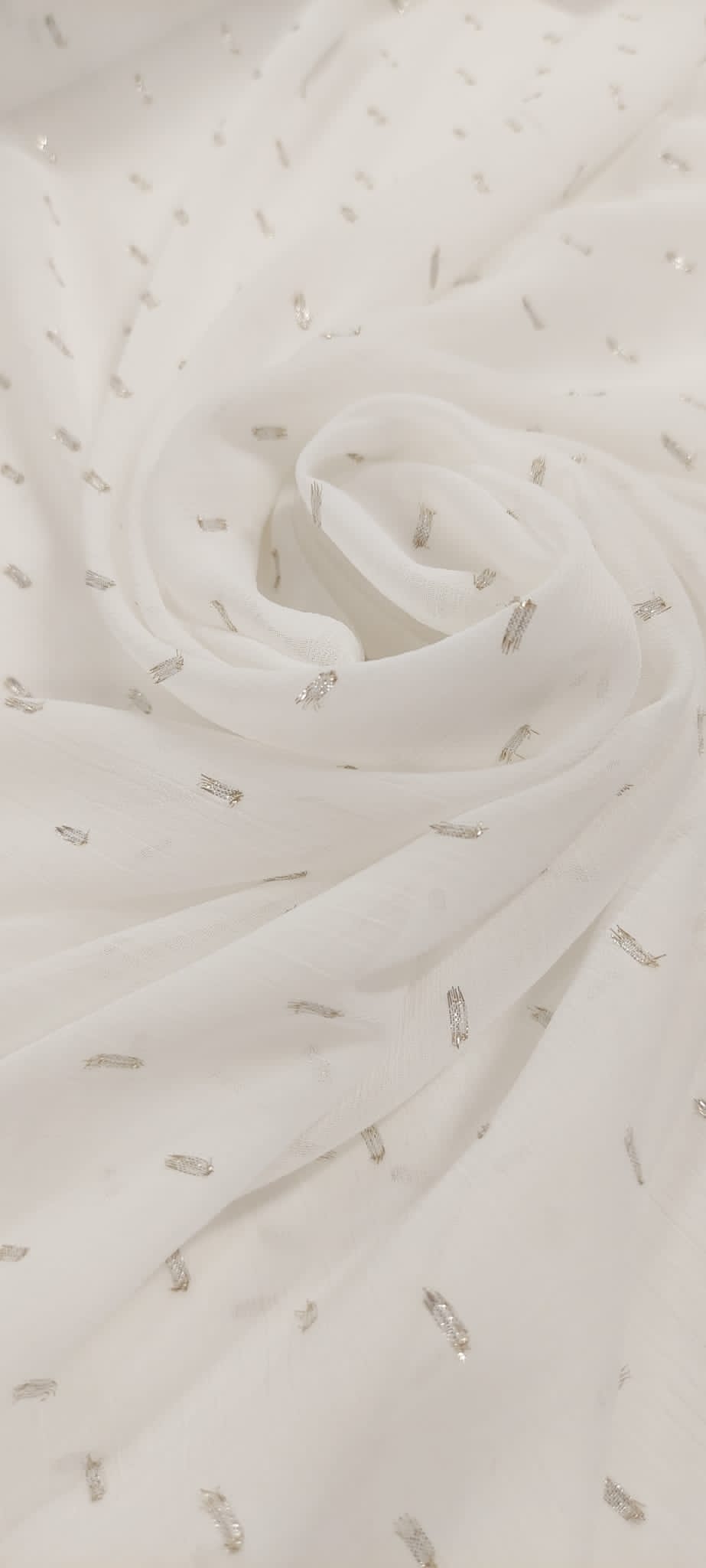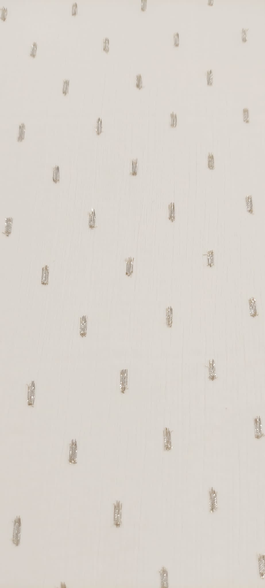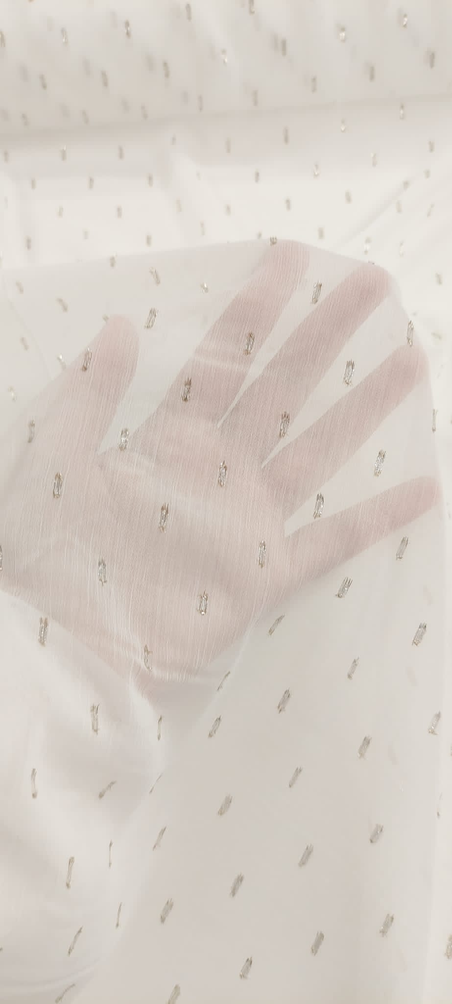 Gasa blanca con plumeti de hilos de lurex en plata y oro. La textura de la tela simula levemente a la bambula.