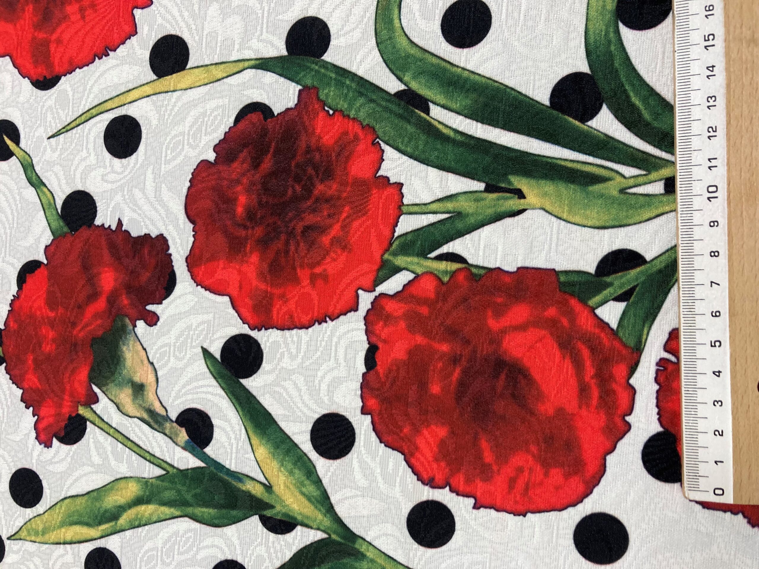 Jacquard de claveles rojos con un fondo blanco con lunares negros.