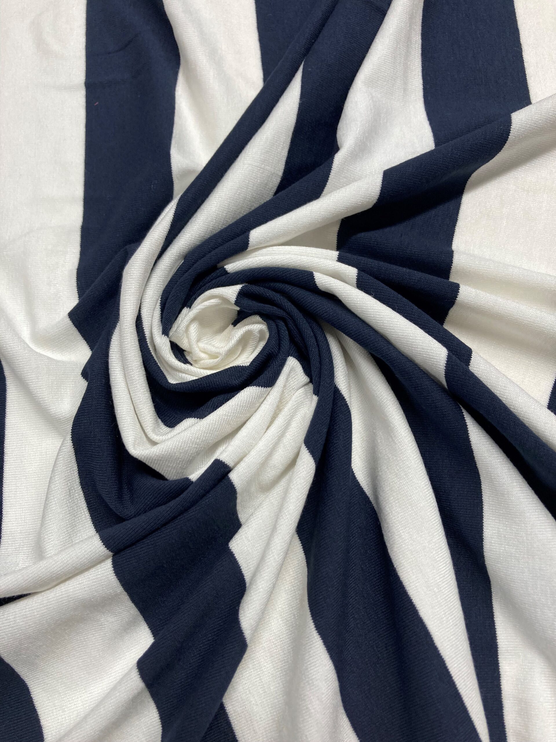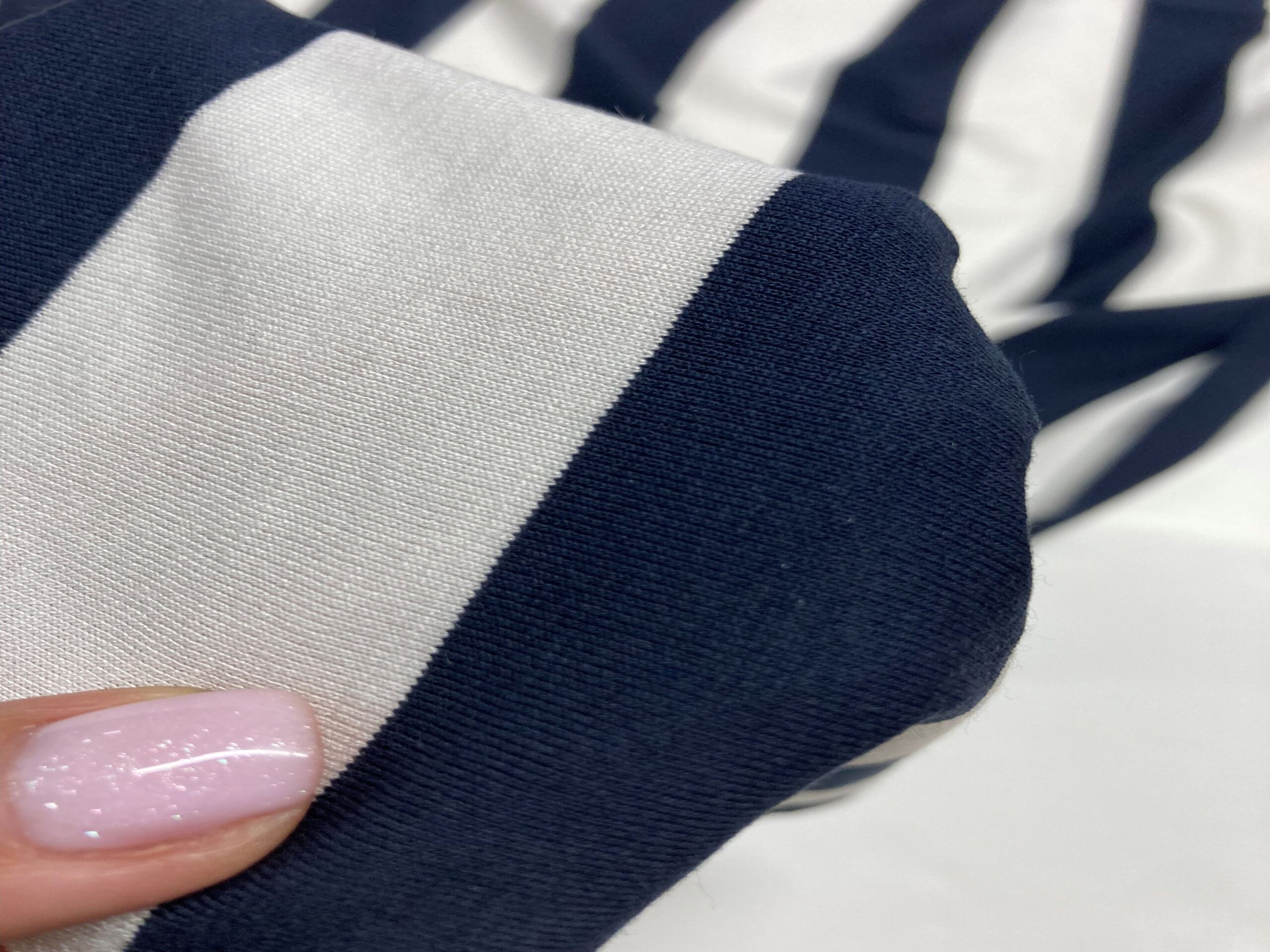 Se trata de una retal de punto de camiseta con rayas de 3 cm y medio en color blanco/marino.