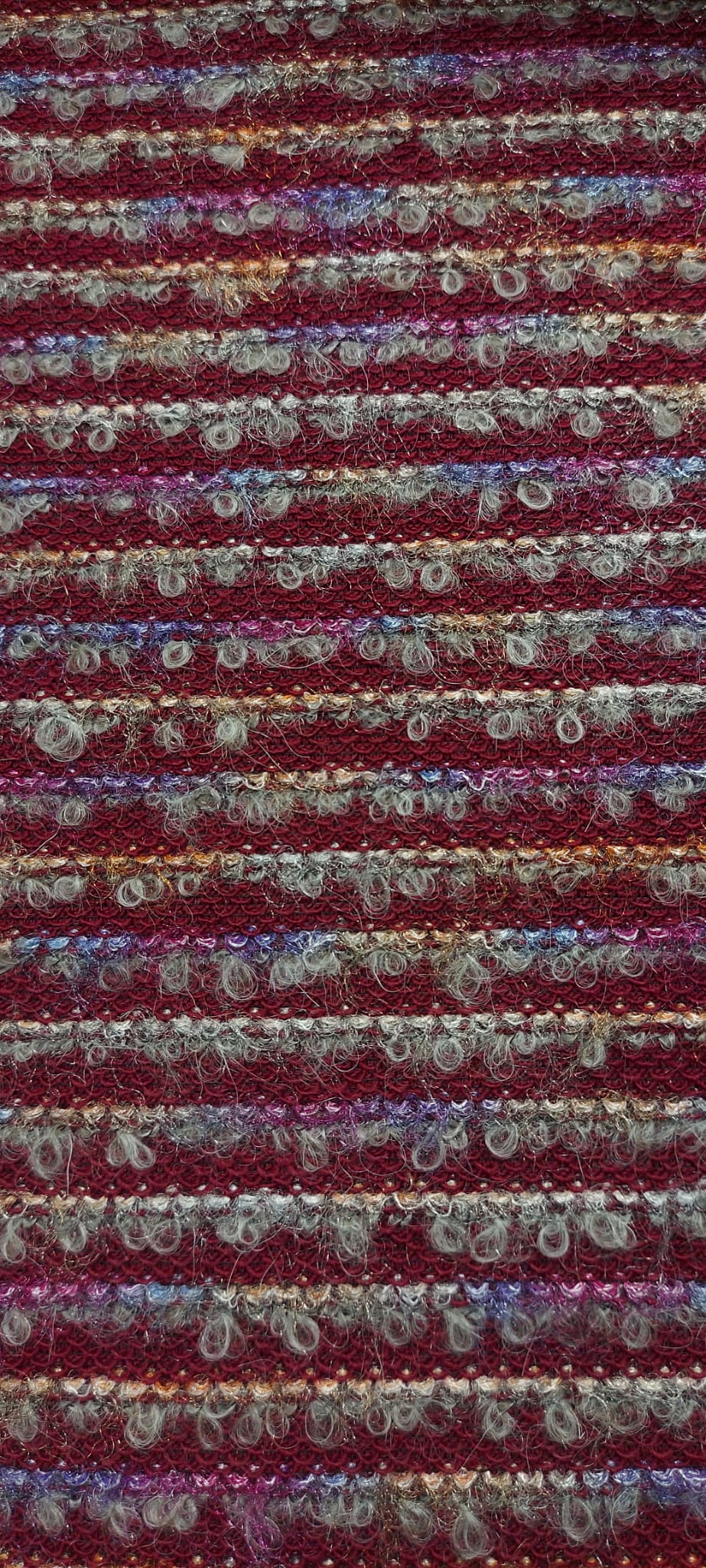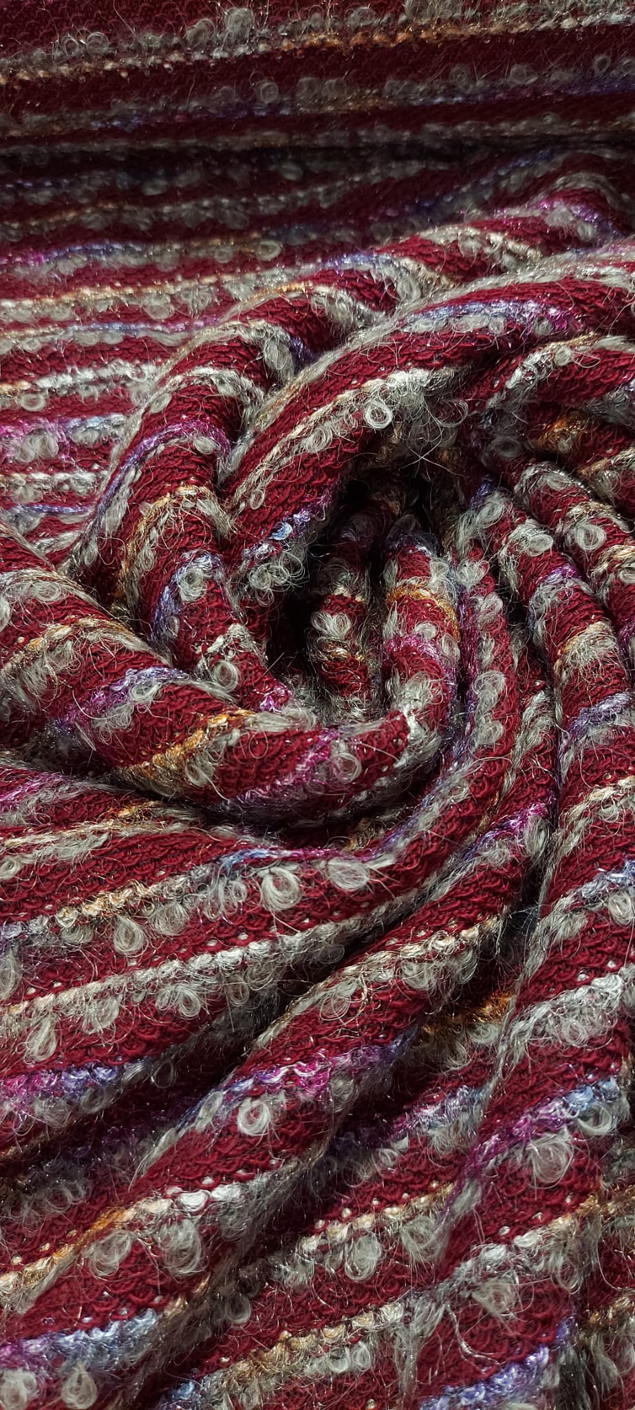 Este punto de lana burdeos es un tejido elástico tejido con hilos tipo vaguilla ligeramente satinados y de tacto muy suave en tonos plateado, dorado, malva y rosa.