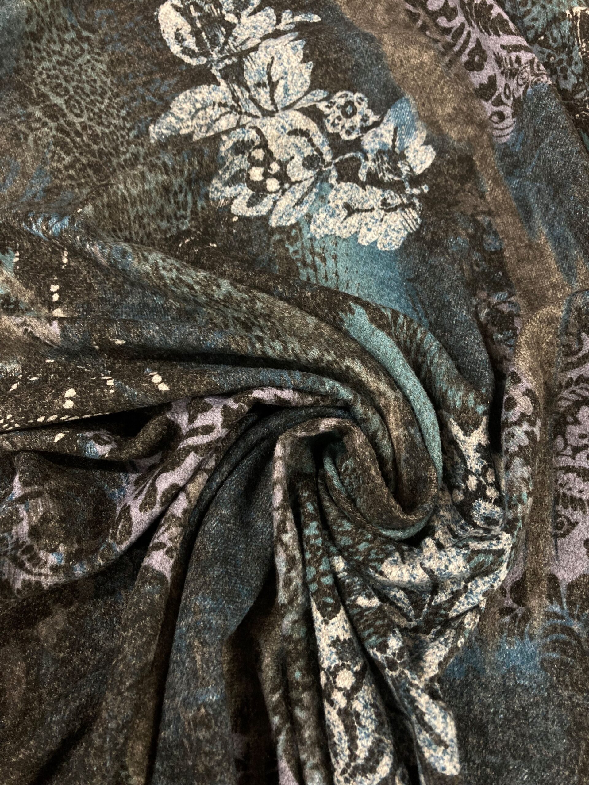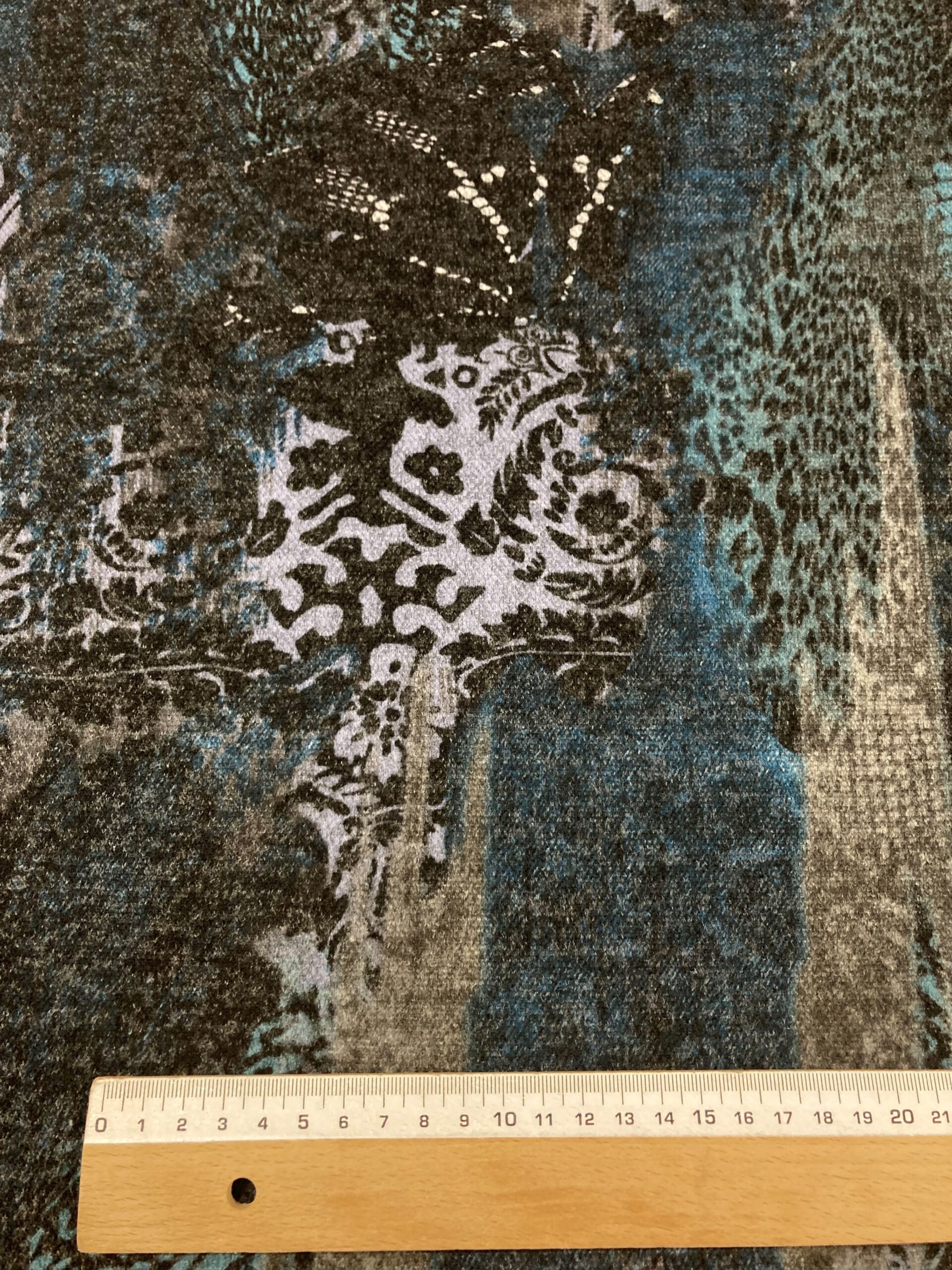 Punto estampado en color negro, blanco y azul. Tejido con muy suave, con caída y de textura muy suave y agradable al tacto. Tela ideal para la confección de ropa