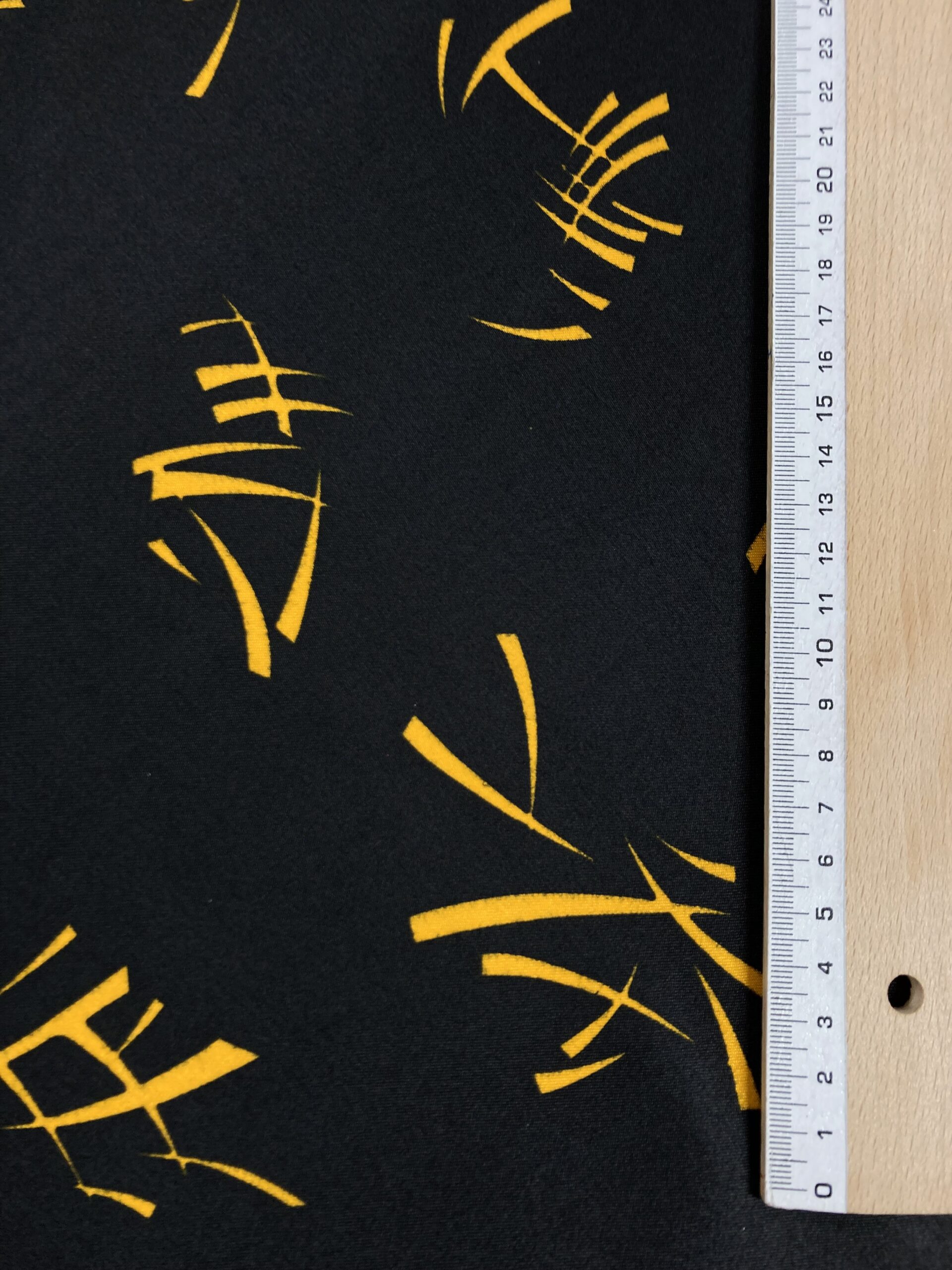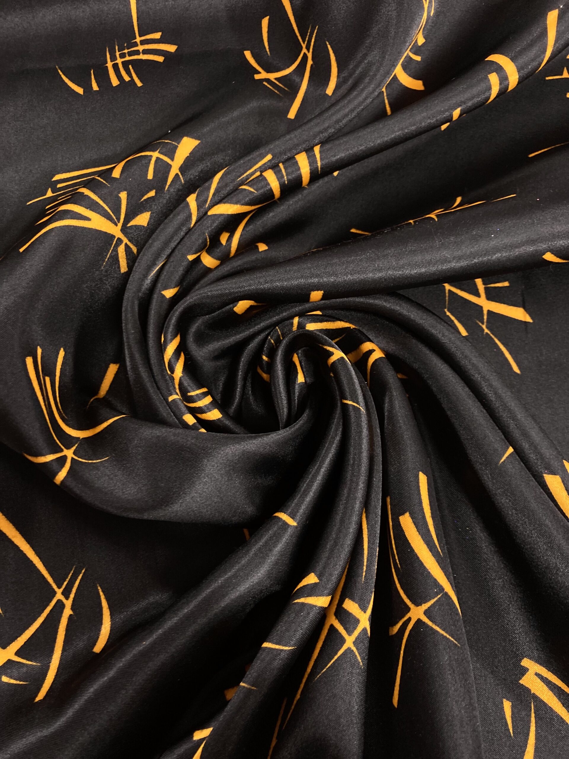 Es un tejido satinado, con caída, de color negro el fondo y las letras en amarillo tostado. Tela utilizado sobre todo para disfraces.