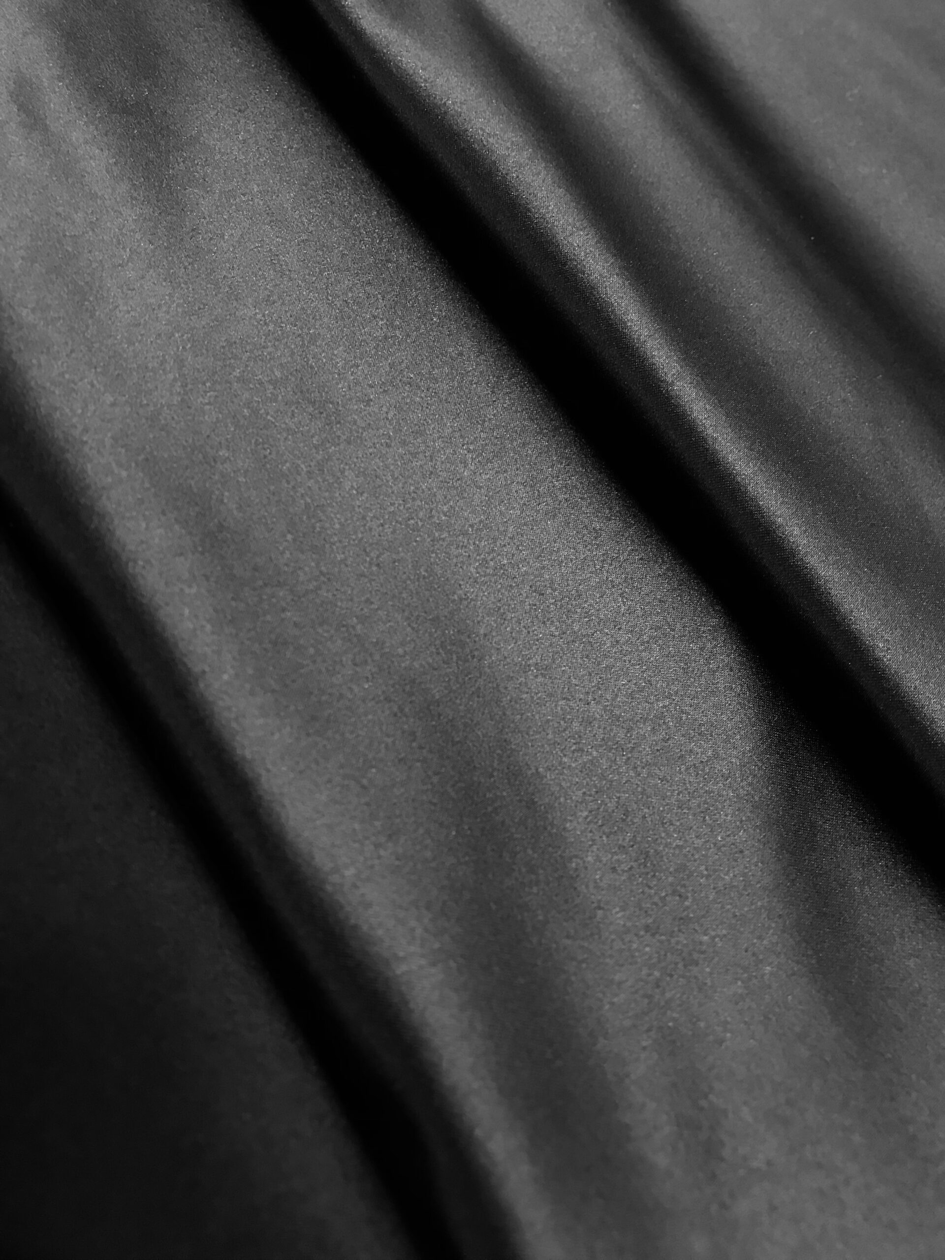 Tela de raso de novia liso de color negro. Tela roja opaca, sostenida, con cuerpo y muy suave, con apariencia que se encuentra entre un discreto brillo y matizado. Raso de novia ideal para vestidos de ceremonia, vestidos de novia y comunión, faldas y boleros.