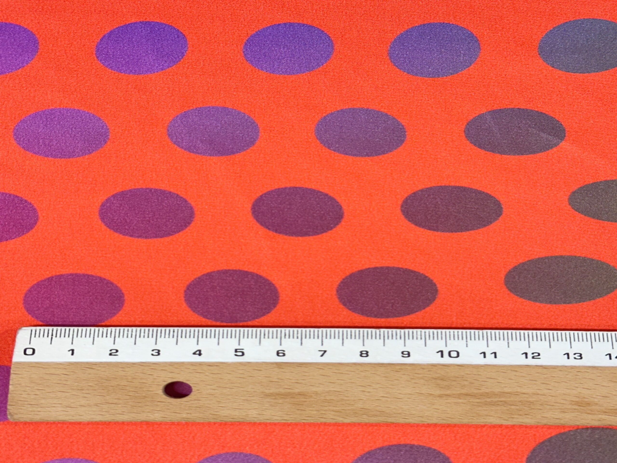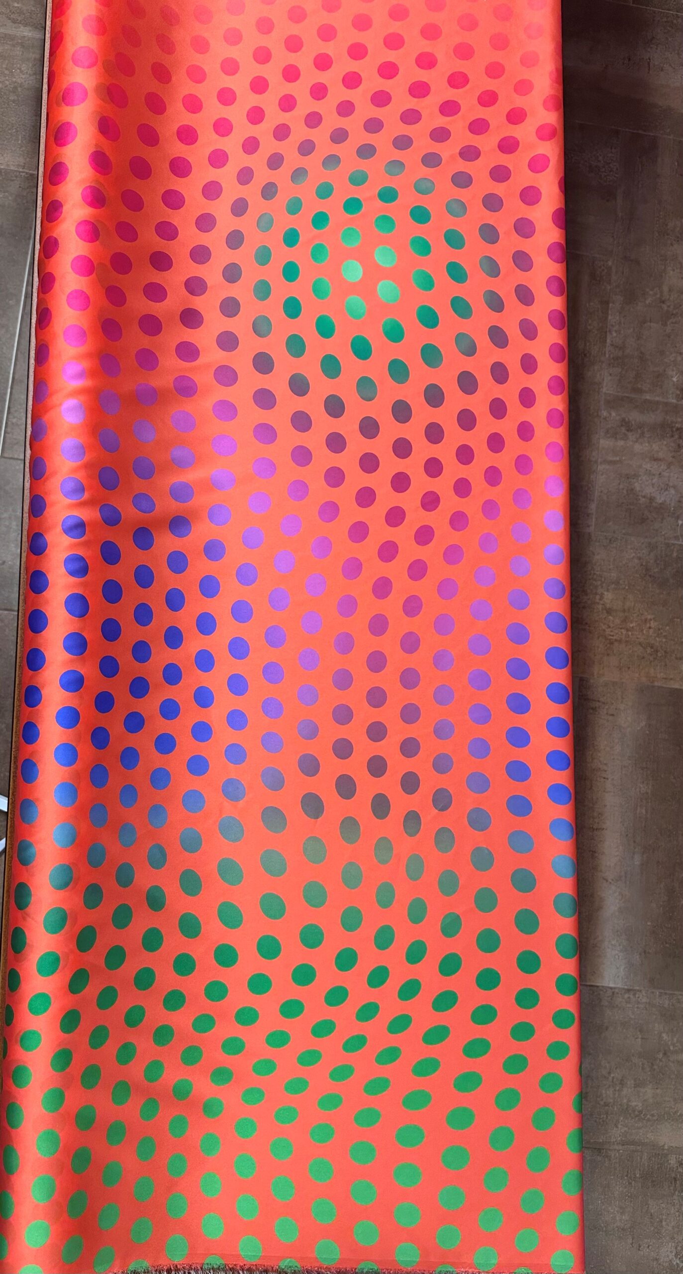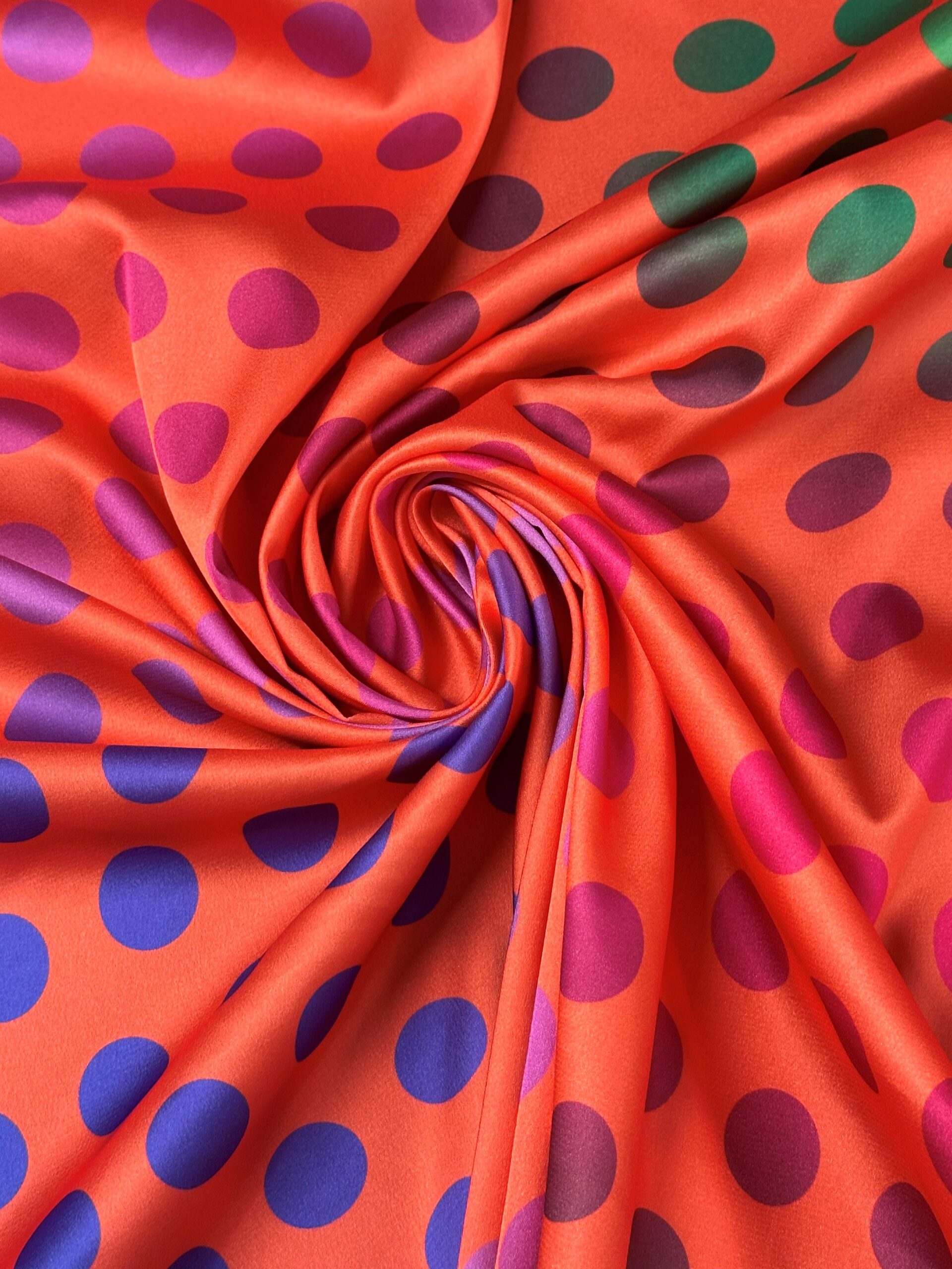 Espectacular tela de satén estampada con lunares que van cambiando de color y de forma. El fondo es color yema de huevo.
