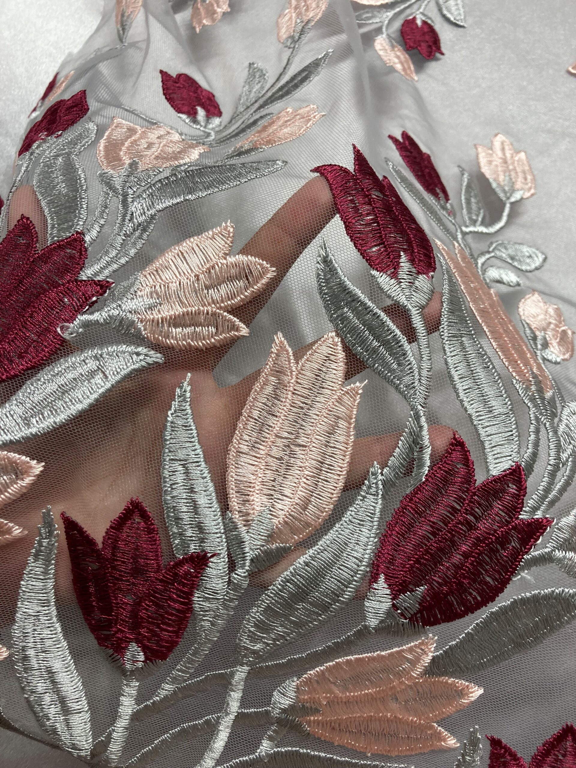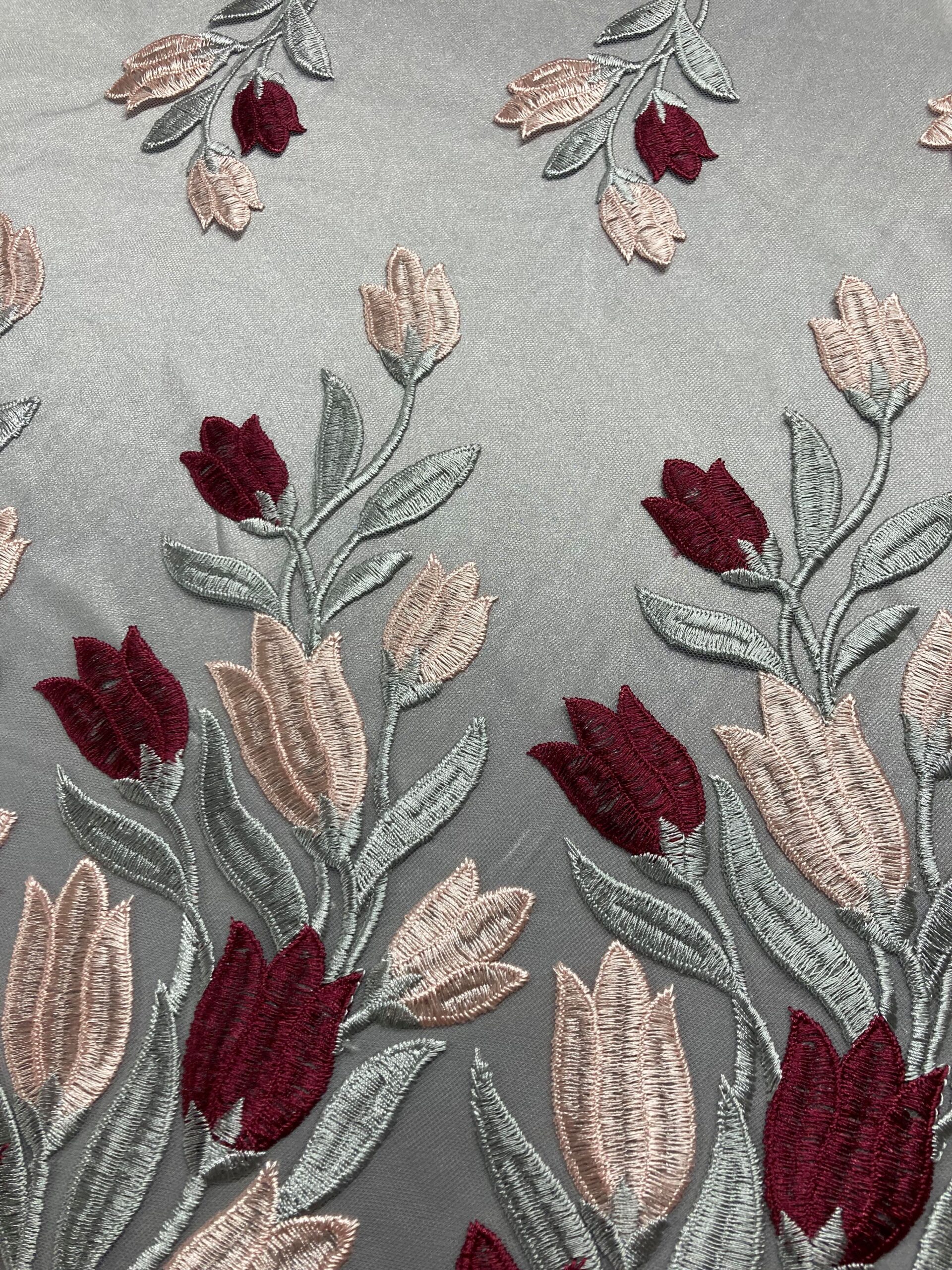 Tul gris con bordado de tulipanes burdeos, rosa `palo y gris plata.