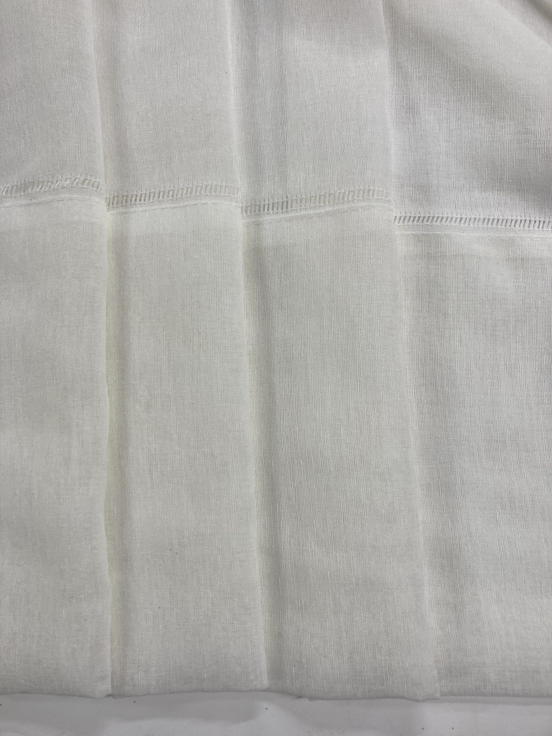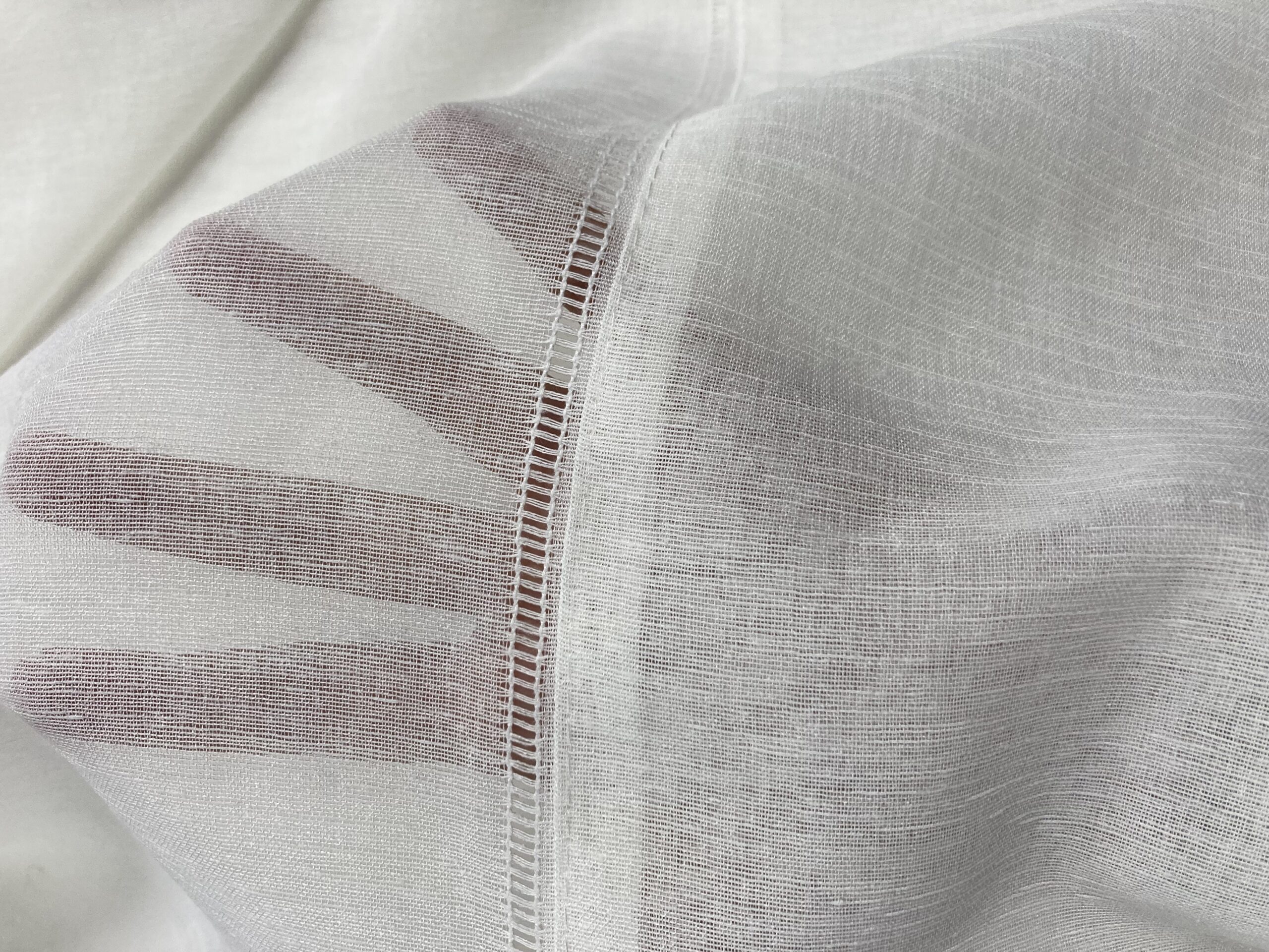 Visillo en color beig y bajo doble con vainica. Al se de poliéster es un visillo muy lavable y no se arruga. Se puede colgar mojado después de lavarlo y queda estupendo.